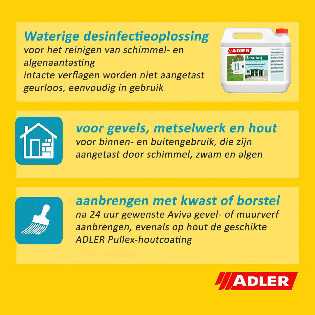 ADLER Aviva Fungisan is een watergedragen desinfectiemiddel dat diep doordringt in het oppervlak en de groei van algen, schimmels en zwammen direct stopzet. Hiermee voorkomt u niet alleen hergroei, maar zorgt u ook voor een schoon, verfklaar oppervlak. Ideaal als voorbereiding bij gevel verven of houtafwerking. - Geschikt voor vrijwel elk oppervlak