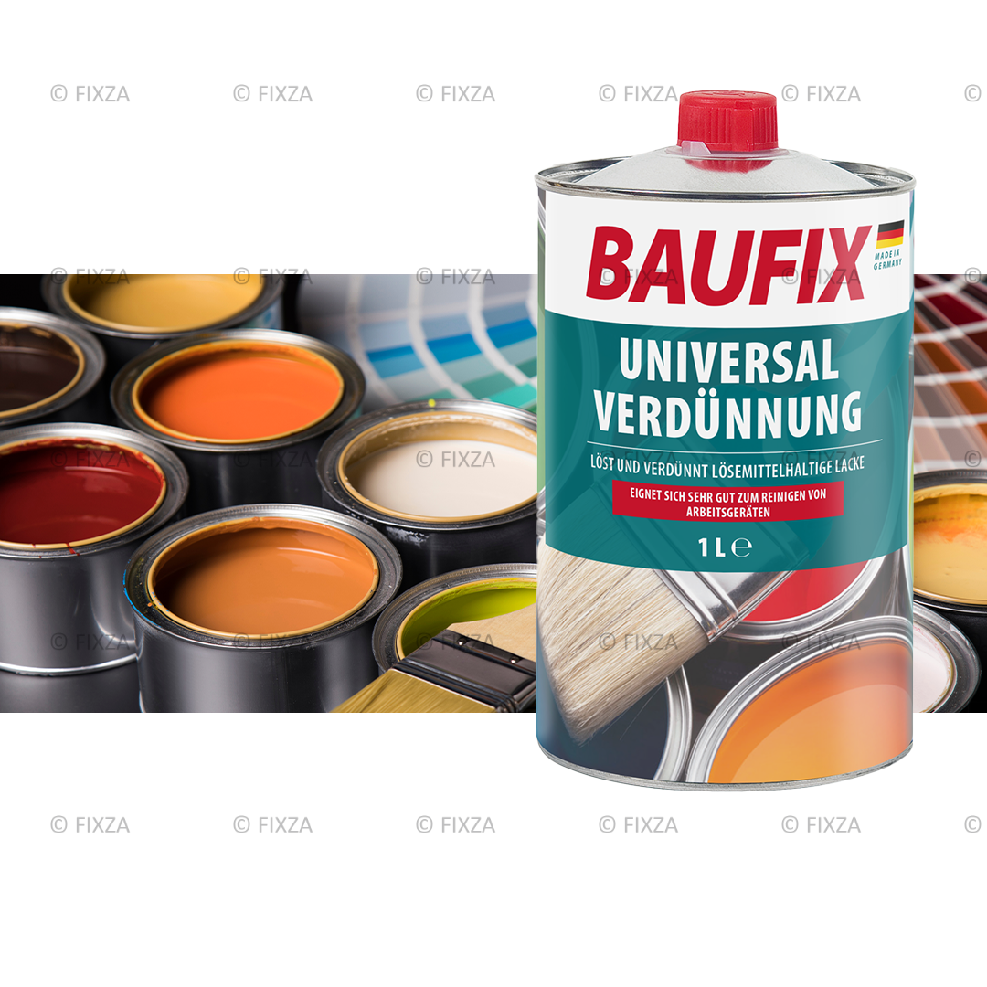 BAUFIX Professionele universele verdunner is een gebruiksklaar, hoogwaardig oplosmiddelmengsel voor verven en lakken en is ideaal voor het reinigen van kwasten, rollers, spuitpistolen en ander gereedschap voor het reinigen van met olie verontreinigd gereedschap, voor kunsthars-, PUR- en rubberlakken als evenals nitro- en combinatieverven.