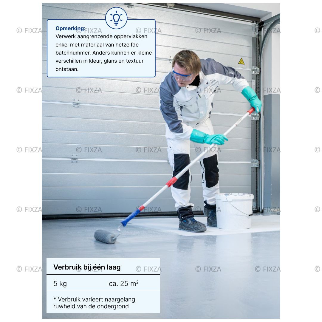 Een verpakking van 5 kg is voldoende voor een oppervlakte van ongeveer 20 m² tot 33 m², afhankelijk van de zuiging en vlakheid van de ondergrond. Of u nu een betonnen vloer wilt beschermen, een garage wilt opknappen of een werkplaats wilt voorzien van een sterke coating, deze vloercoating levert altijd uitstekende resultaten. En een gecoate betonvloer is veel makkelijker schoon te maken, ten opzichte van een onbehandelde betonvloer waar vuil in trekt.
